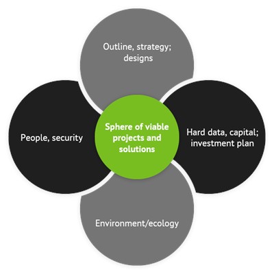 Correspondingly the planning of a building project rests upon varying realities (actual position) and also upon technical pressures (political decisions). Within these framework requirements, to which belong, for example, hard data and capital, people and safety, environment and ecology, can be found the realm of realistic projects and solutions.